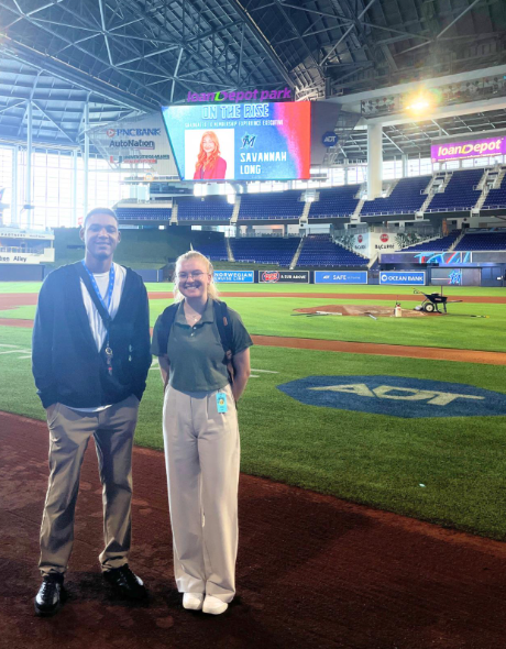 Ashley (right) and Ron Hampton (former ADT Summer 2023 Intern, pictured left), at the Miami Marlins stadium to set up the ADT Home Plate Suite for an event.