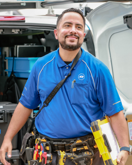 Logo, A D T. — Text, Lance G. — Technician/Smart Home Consultant. Lance parks his ADT truck in a customer’s driveway and heads to their front door.